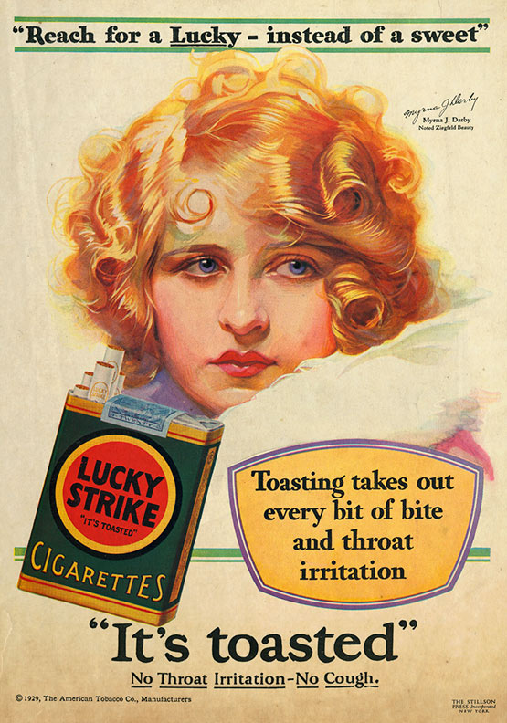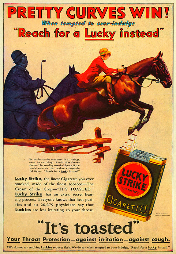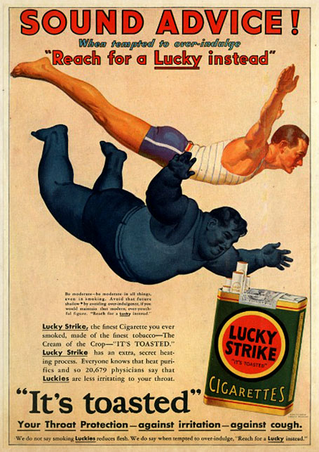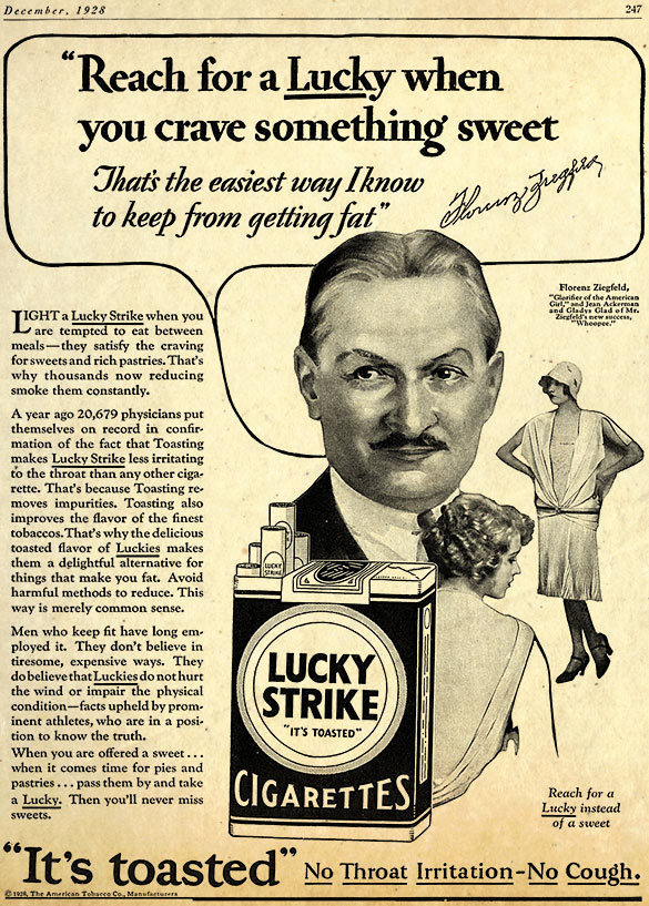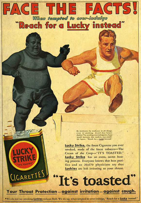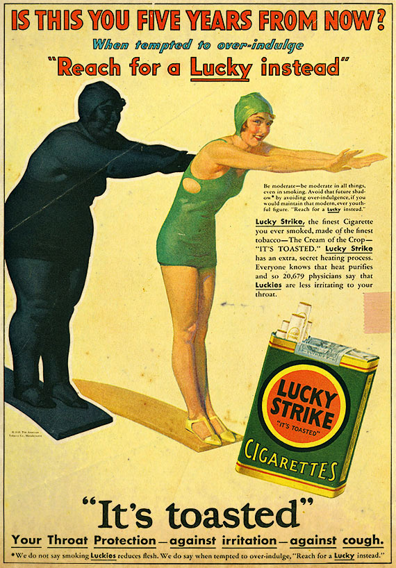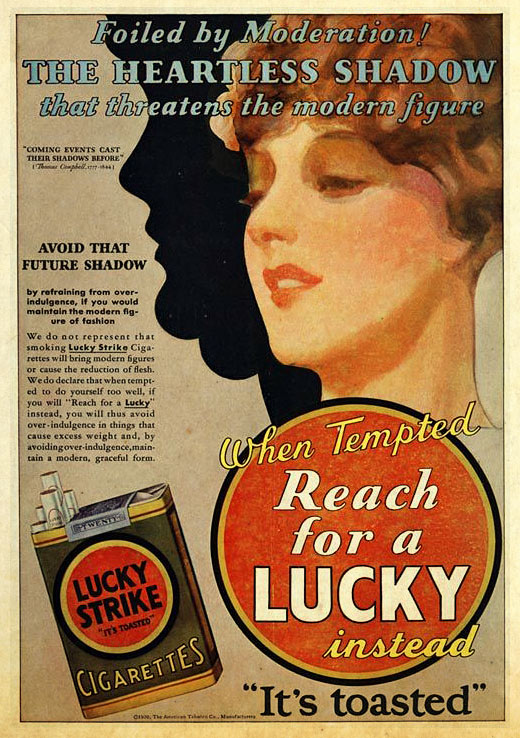 “Light a Lucky Strike when you are tempted to eat between meals. They satisfy the craving for sweets and rich pastries. That’s why thousands now reducing (dieting) smoke them constantly.” – Luck Strike ad, 1928