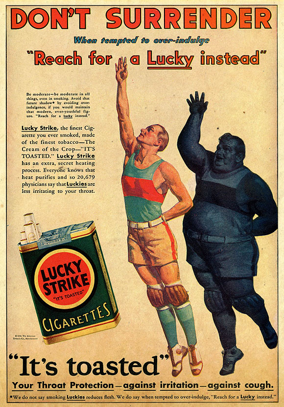 “Reach for a Lucky when you crave something sweet. That’s the easiest way I know to avoid getting fat.” – Lucky Strike slogan / ad, 1928