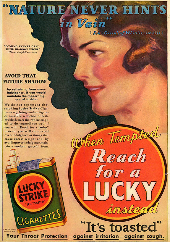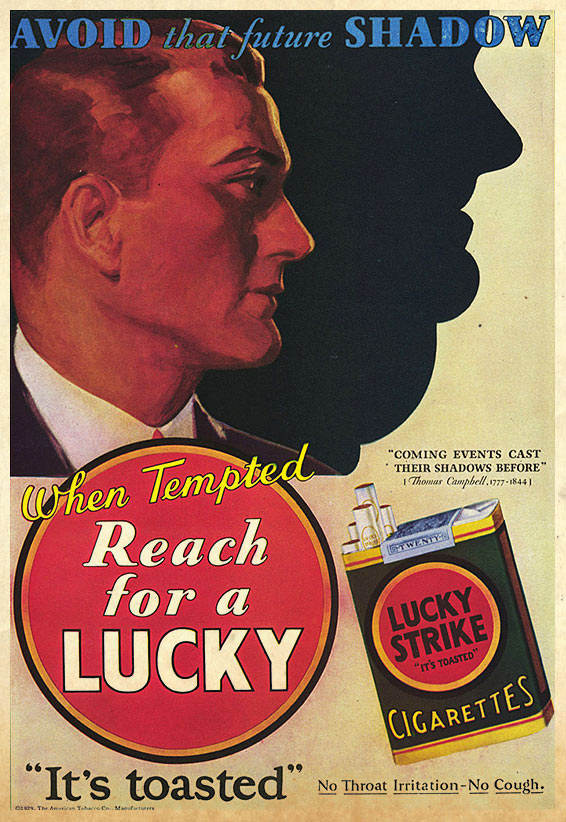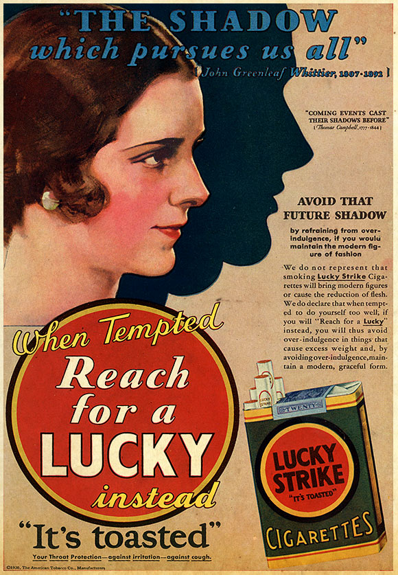 Many of Lucky Strike’s ads made dubious claims about the potential health benefits of smoking including weight loss. One of their most successful campaigns warned women and men to, “avoid that future shadow,” inferring that by smoking cigarettes you could stay fit, curb cravings, and avoid your obese and unhealthy destiny.